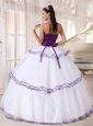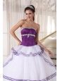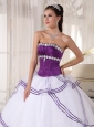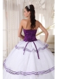 This straplesspurple and white quinceanera dress is addornes by the exquisite beadwork and the boning details flatters most figures.While the bouffant skirt with a constrasting colored-hemmings makes the dress so unique that you will attain more attention. A lace up back completes this wonderful design.