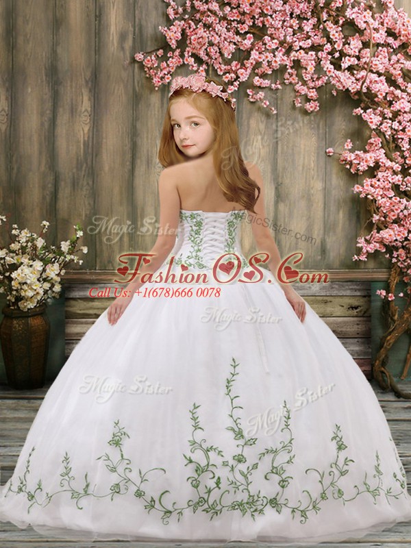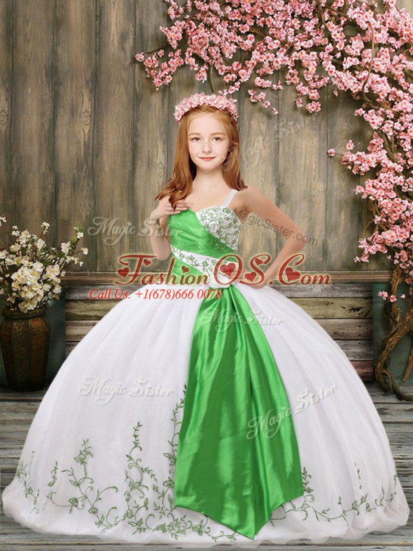Gorgeous White Ball Gowns Straps Sleeveless Organza Floor Length Lace Up Embroidery and Belt Little Girl Pageant Gowns
