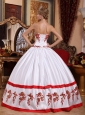 Its your big day, so you might as well shine in this gorgeous strapless ball gown quinceanera dress! You will steal the show in this breathtaking gown, whose ornate bodice is topped off by a subtle curved neckline. Complete with lace up back and partial overlay on bodice leading to full ball gown skirt with embroidered hem climbing up skirt.