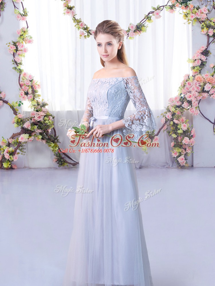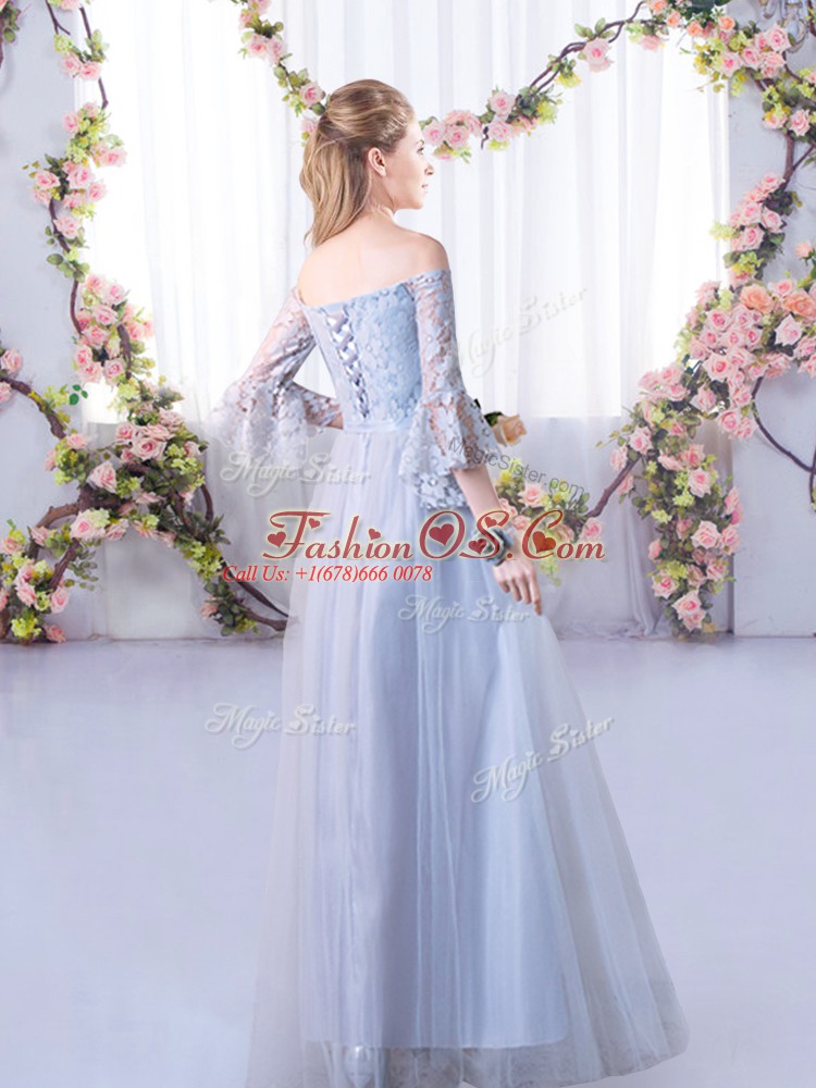 Graceful Floor Length Lace Up Quinceanera Dama Dress Grey for Wedding Party with Lace