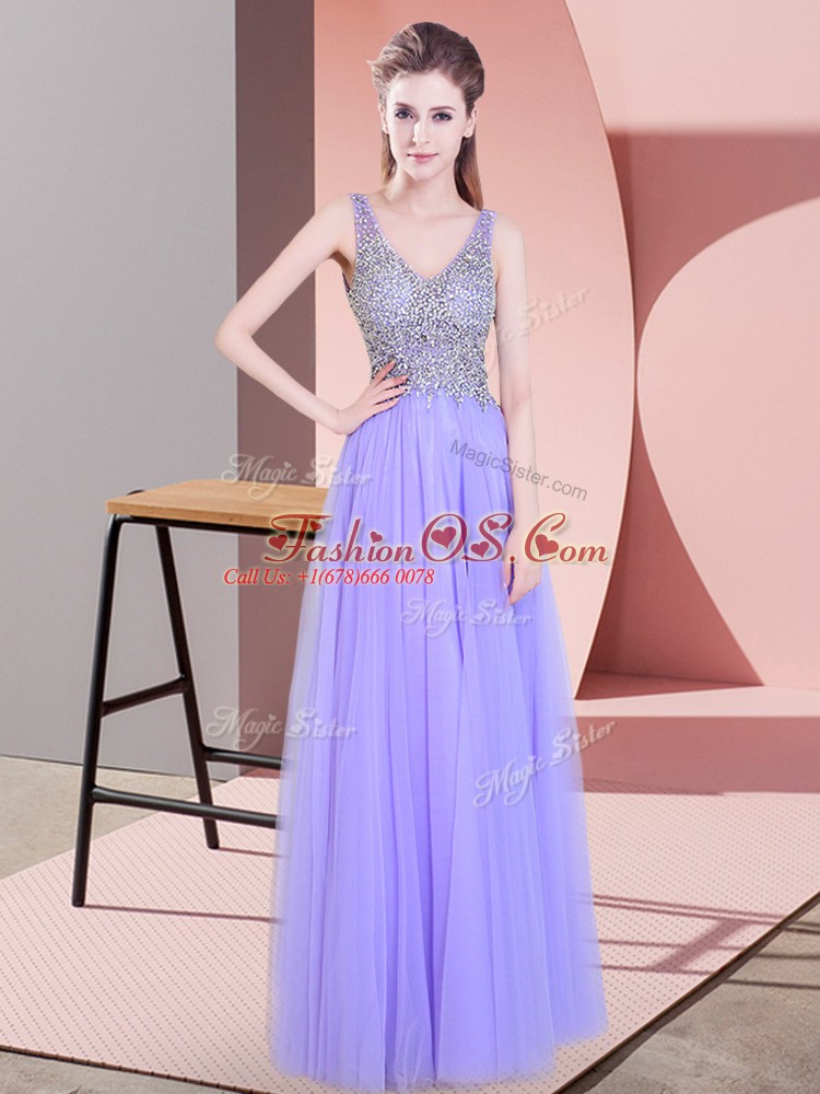 Graceful Floor Length Lavender Dress for Prom Tulle Sleeveless Beading