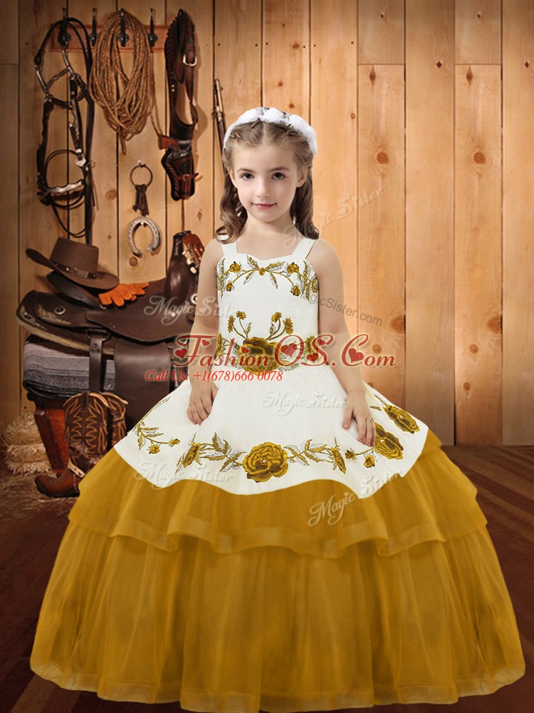 Graceful Gold Lace Up Little Girls Pageant Gowns Embroidery and Ruffled Layers Sleeveless Floor Length