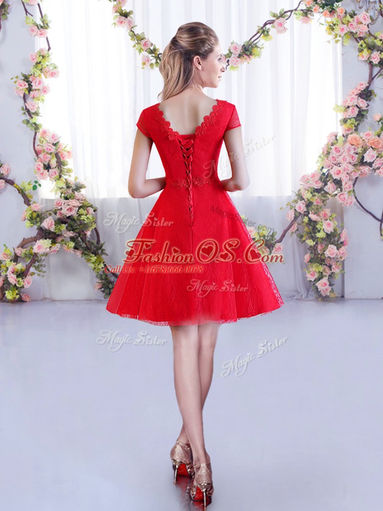 Graceful Green A-line V-neck Cap Sleeves Lace Mini Length Lace Up Lace Dama Dress