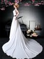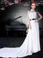 Graceful Halter Top Sleeveless Court Train Appliques and Belt Backless Prom Dresses