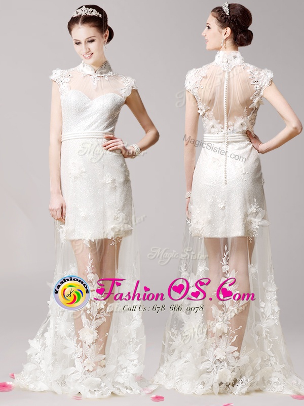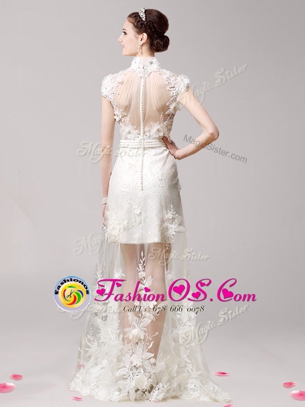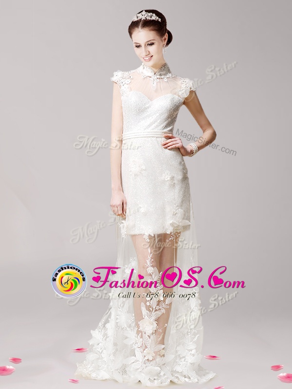 Graceful High-neck Cap Sleeves Brush Train Clasp Handle Prom Evening Gown White Tulle