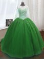 Graceful Scoop Green Organza Lace Up Quince Ball Gowns Long Sleeves Sweep Train Beading and Sequins