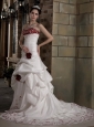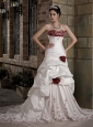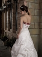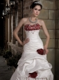 If you are inclined to add a little shine to your big wedding day, this graceful skirt dress features strapless with beading and ruched bodice to accent your sim figure may help you. The wine red fabric with beading and applique bustline will make the dress fit you well. The same wine red hand-made flower on the skirt will make you more attractive when you wearing this dress. There is also some pick-ups and bubble on the outlayer skirt, the appliques on the champel train add more beauty to the dress. A hidden zipper makes for easy off and on and secures the dress in place.
