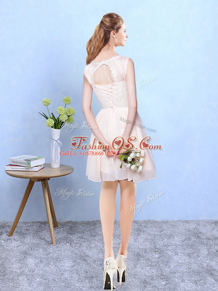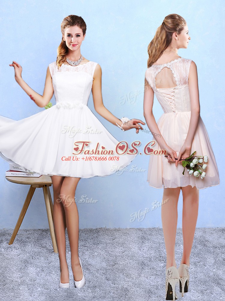 Graceful White A-line Lace and Appliques Vestidos de Damas Lace Up Chiffon Sleeveless Knee Length