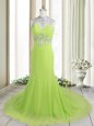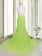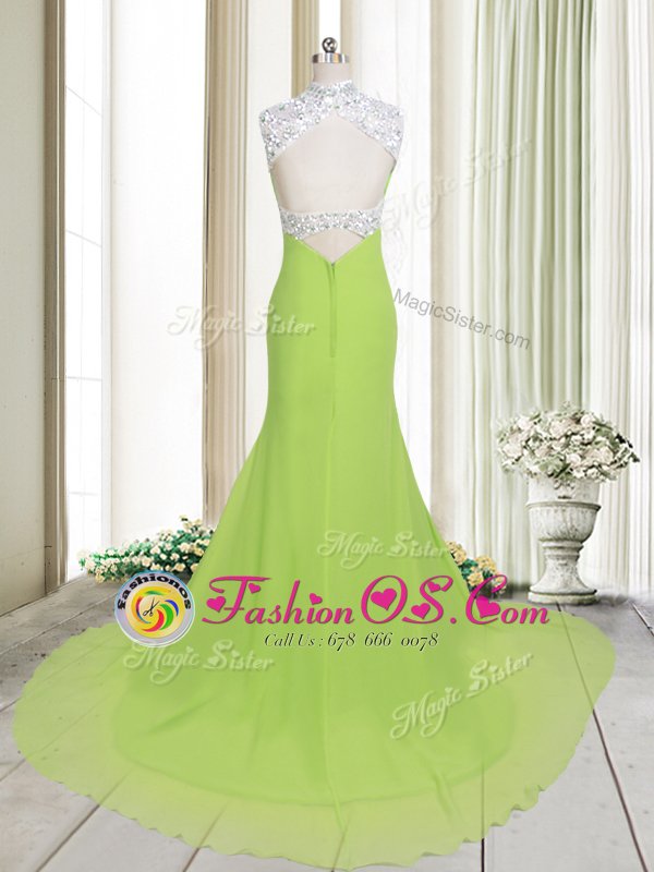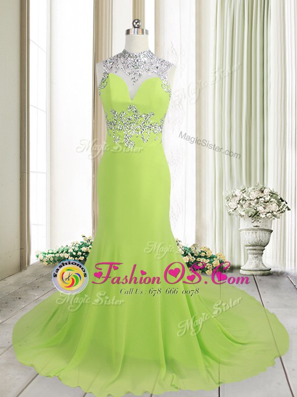 Graceful Yellow Green Column/Sheath High-neck Sleeveless Chiffon Brush Train Backless Beading Celebrity Dress