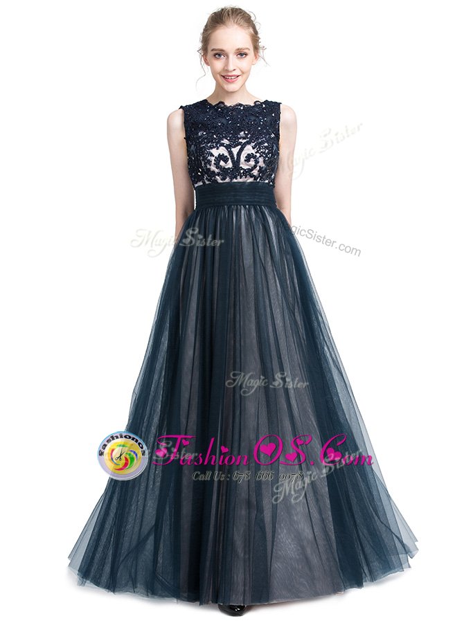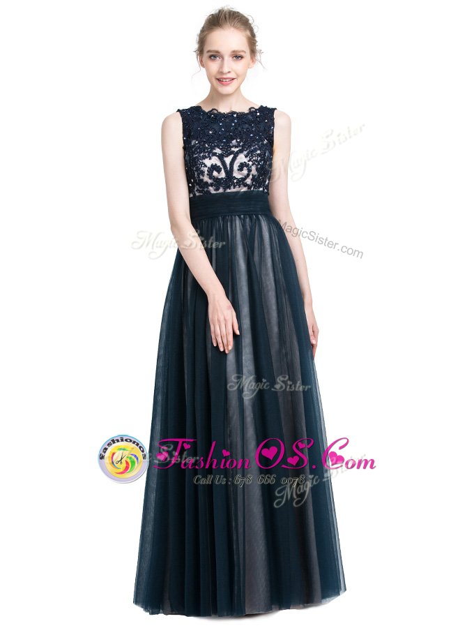 Great Floor Length Navy Blue Homecoming Gowns Scalloped Sleeveless Zipper