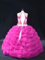 Home >  Quinceanera Dresses >  Clearance Quinceanera Dresses > Great Fuchsia Ball Gowns Organza Halter Top Sleeveless Beading and Lace and Pick Ups Floor Length Backless Ball Gown Prom Dress