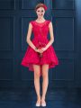 Great High Low Wine Red Wedding Guest Dresses Satin and Lace Sleeveless Lace and Belt