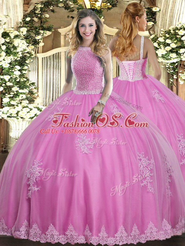 Great High-neck Sleeveless Ball Gown Prom Dress Floor Length Beading and Appliques Rose Pink Tulle