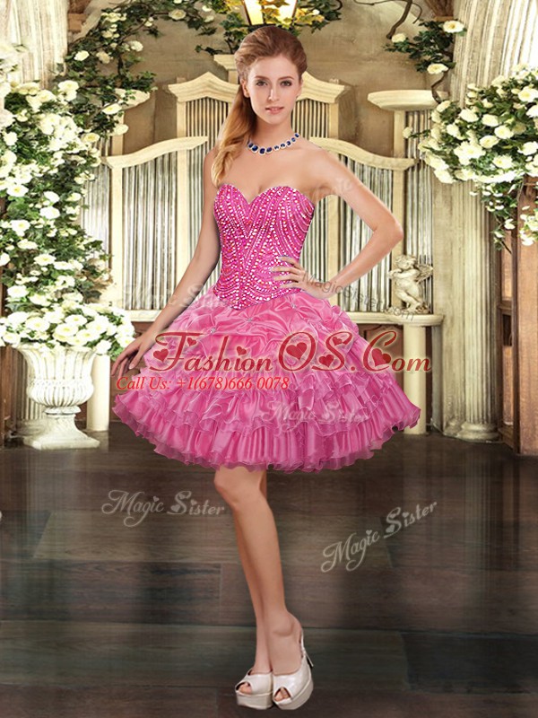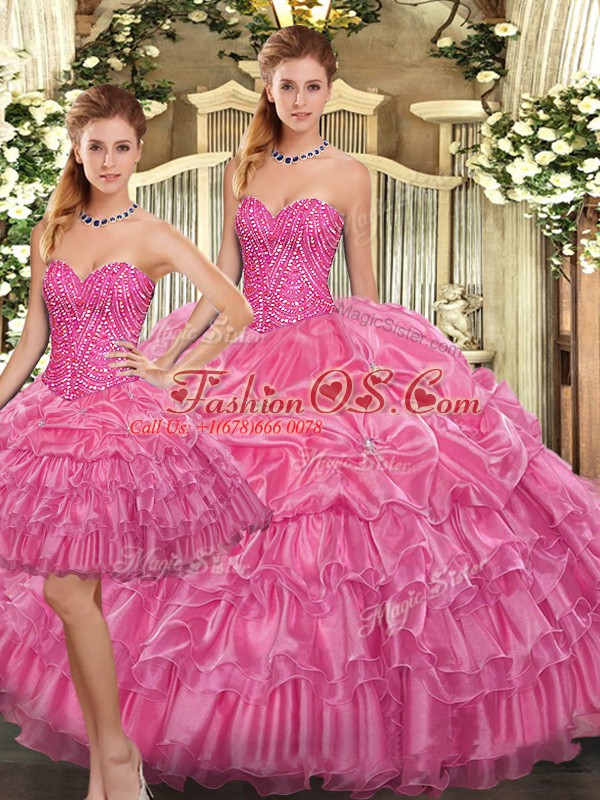 Great Rose Pink Sleeveless Organza Lace Up 15th Birthday Dress for Military Ball and Sweet 16 and Quinceanera