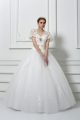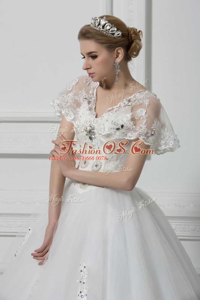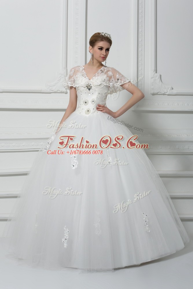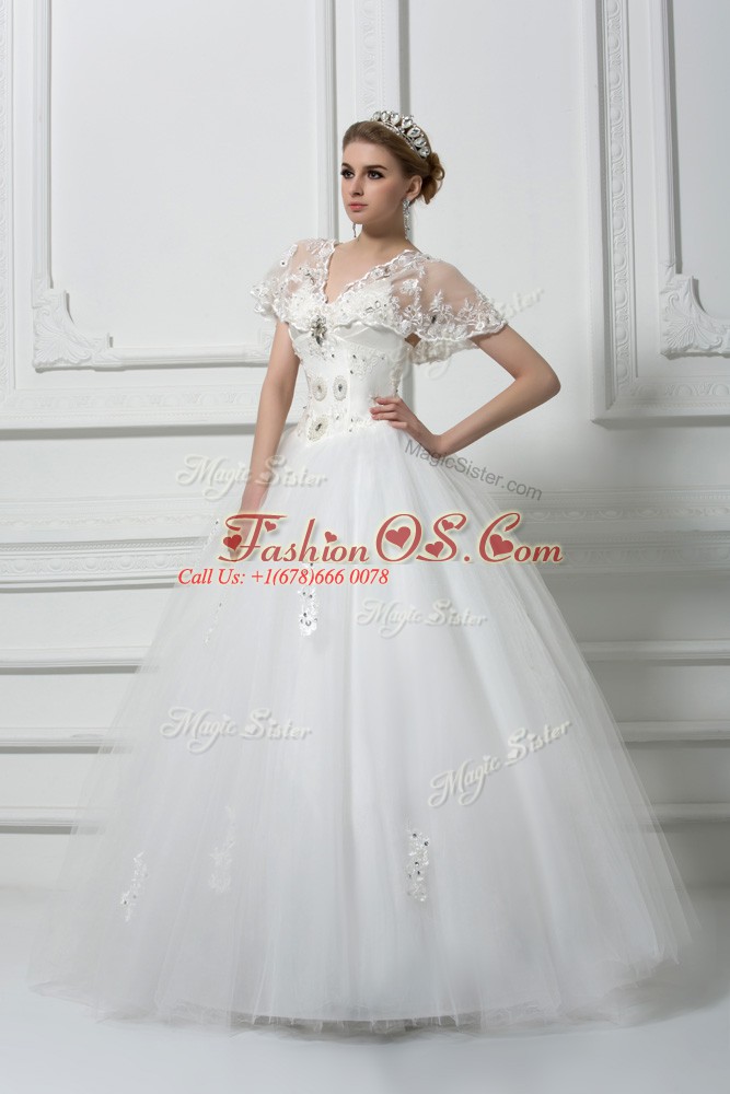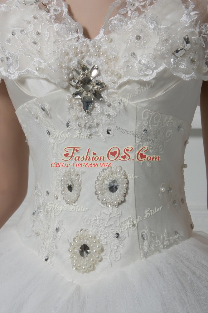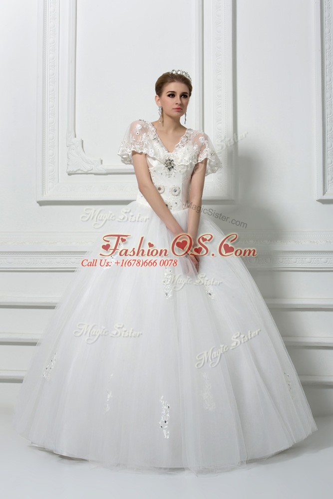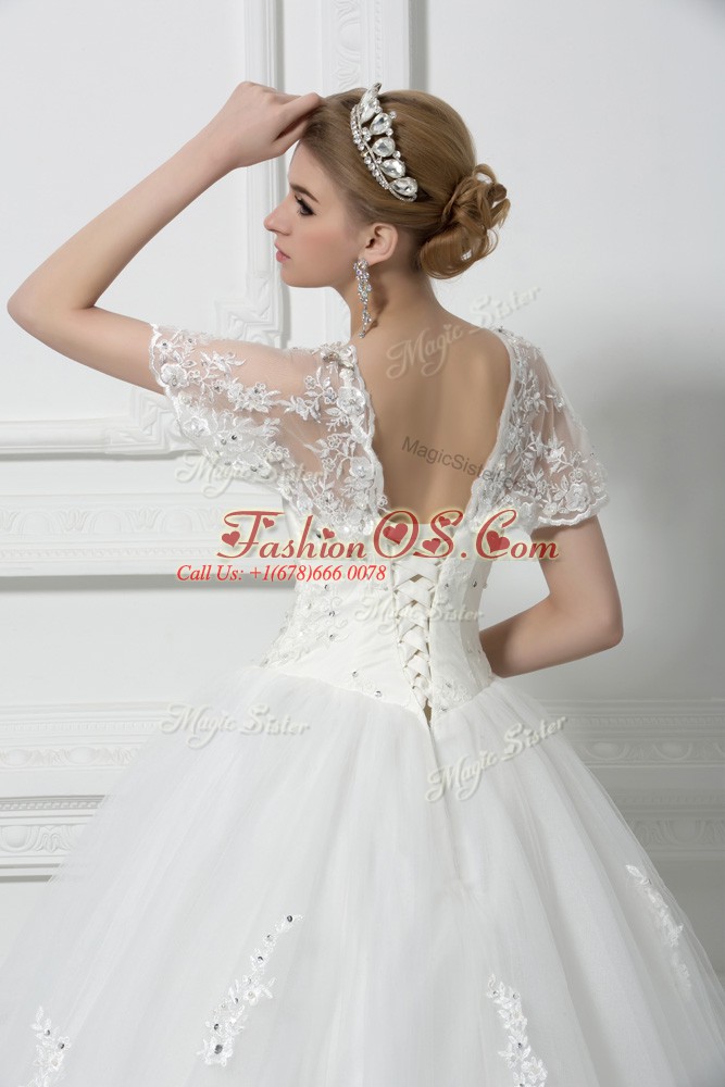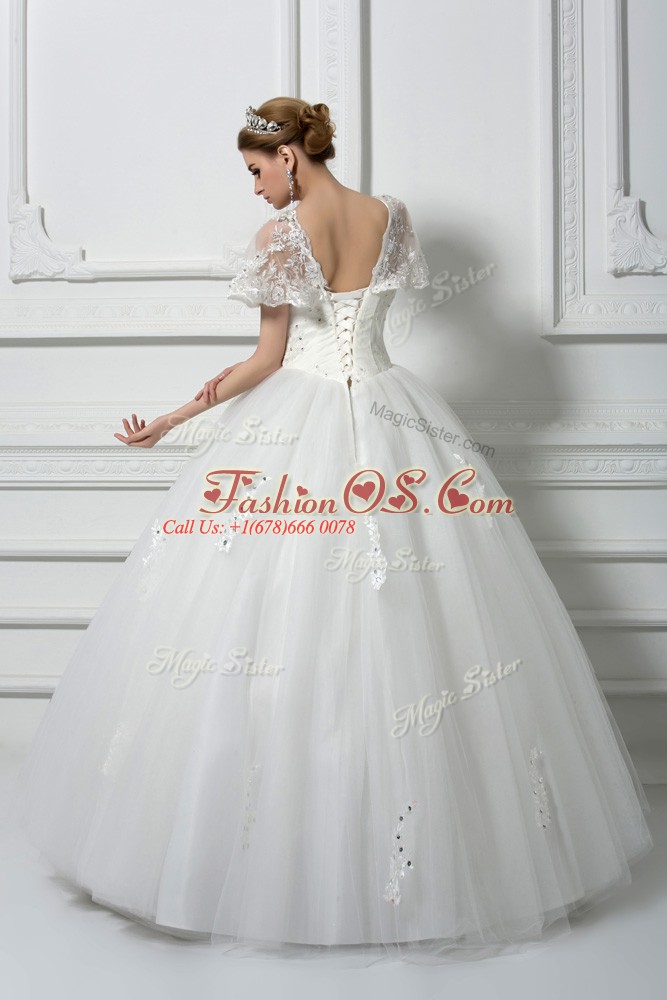 Great White Short Sleeves Floor Length Beading and Appliques Lace Up Wedding Dresses