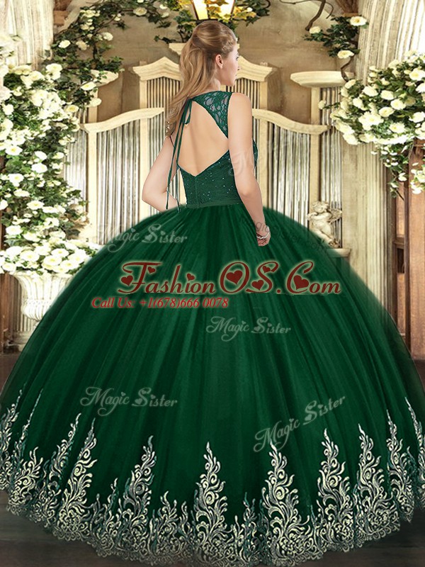Green Backless V-neck Beading and Lace and Appliques Quinceanera Gowns Tulle Sleeveless