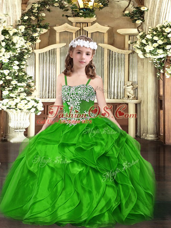 Green Ball Gowns Straps Sleeveless Organza Floor Length Lace Up Appliques and Ruffles Girls Pageant Dresses