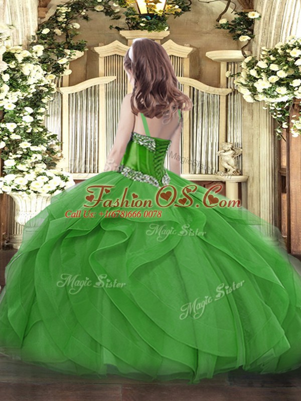 Green Ball Gowns Straps Sleeveless Tulle Floor Length Lace Up Beading and Ruffles Pageant Gowns