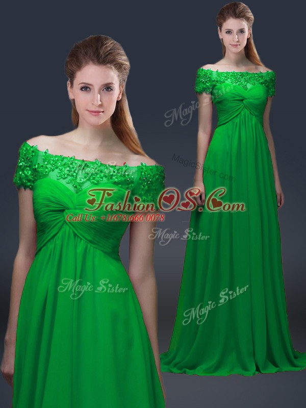 Green Chiffon Lace Up Off The Shoulder Short Sleeves Floor Length Mother Of The Bride Dress Appliques