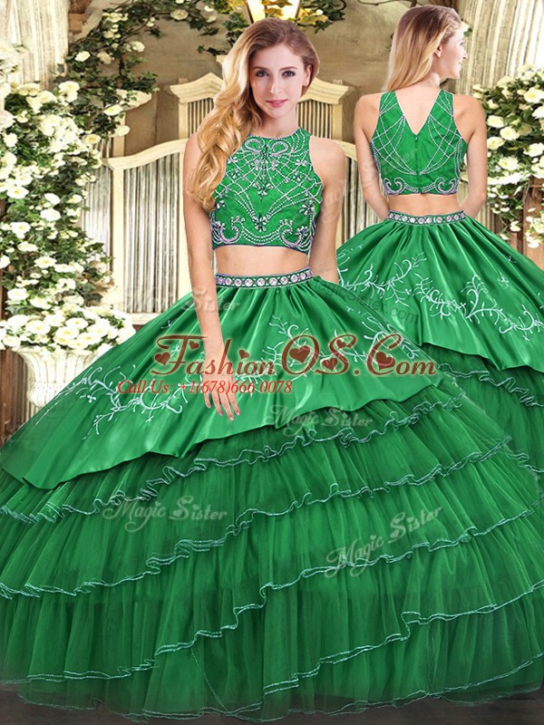 Home >  Quinceanera Dresses >  Best Quinceanera Dresses > Green High-neck Zipper Beading and Embroidery and Ruffled Layers 15 Quinceanera Dress Sleeveless
