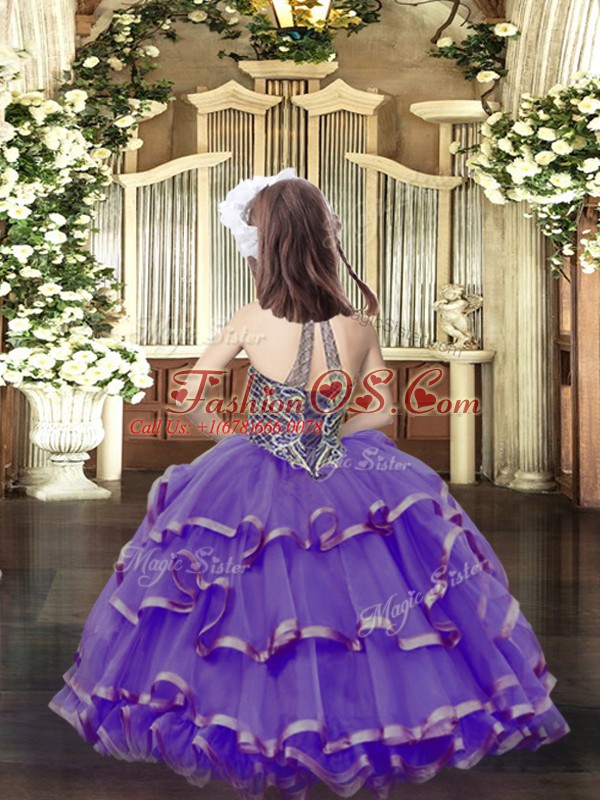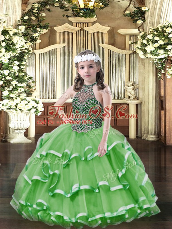 Home >  Special Occasion Dresses >  Pretty Little Girl Pageant Dresses > Green Organza Lace Up Halter Top Sleeveless Floor Length Child Pageant Dress Beading and Ruffled Layers