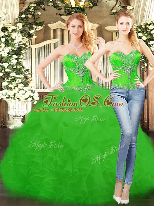 Green Sleeveless Floor Length Beading and Ruffles Lace Up Quinceanera Dress
