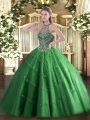Green Sleeveless Floor Length Beading Lace Up Quinceanera Gown