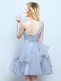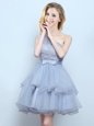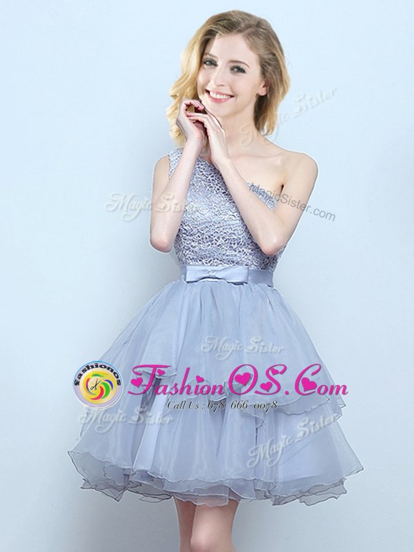 Grey A-line Organza One Shoulder Sleeveless Lace and Ruffles and Belt Mini Length Lace Up Quinceanera Dama Dress
