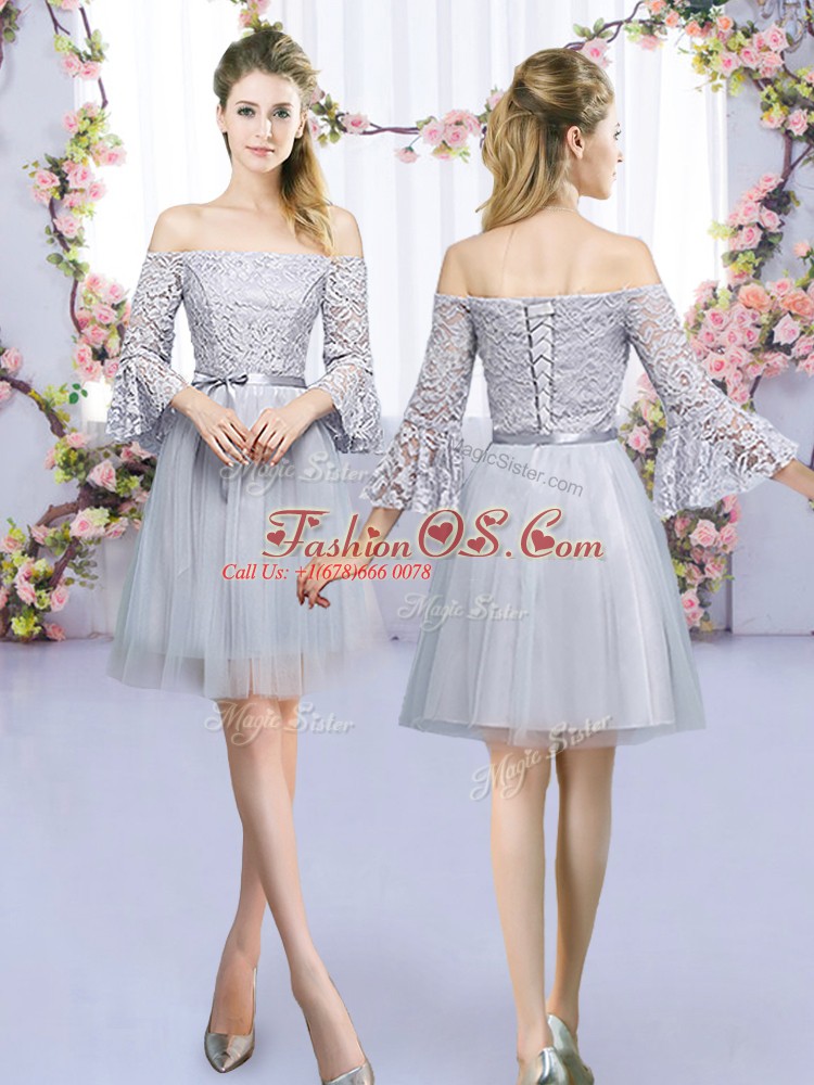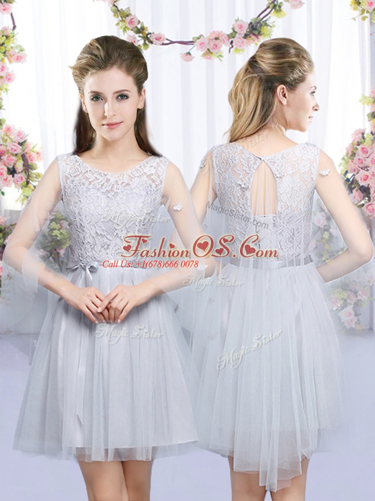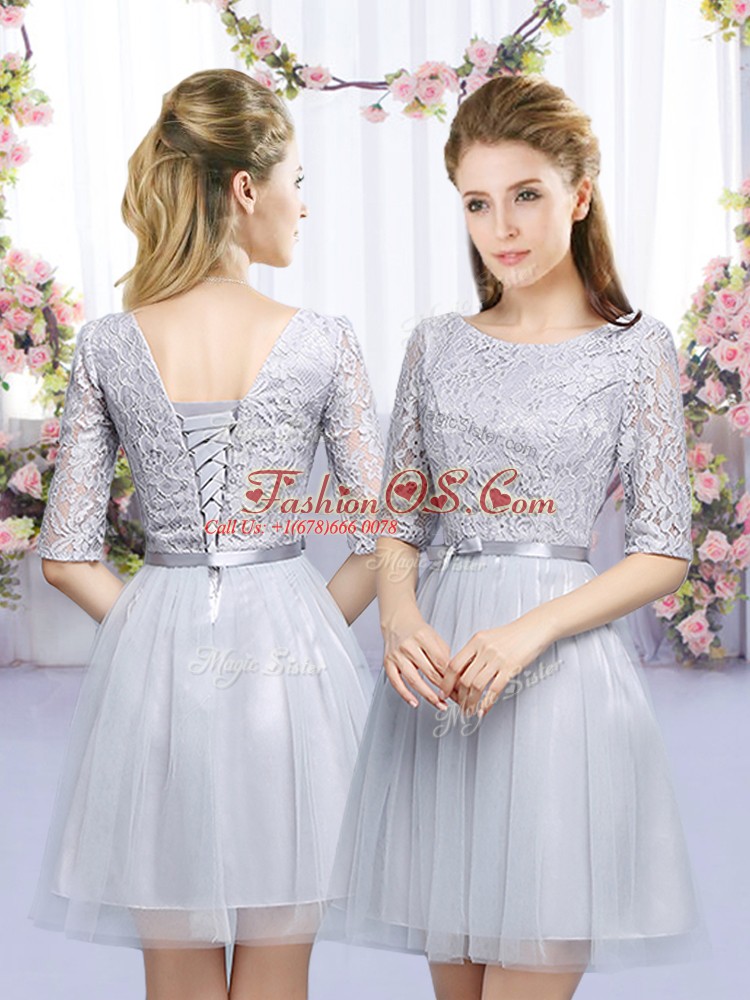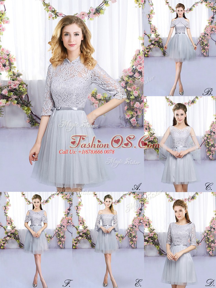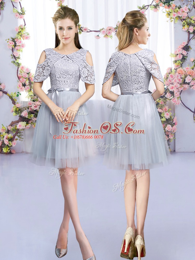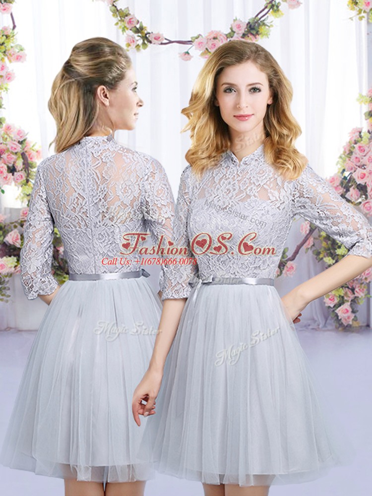 Grey Empire High-neck Half Sleeves Tulle Mini Length Zipper Lace and Belt Quinceanera Court Dresses