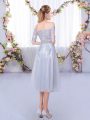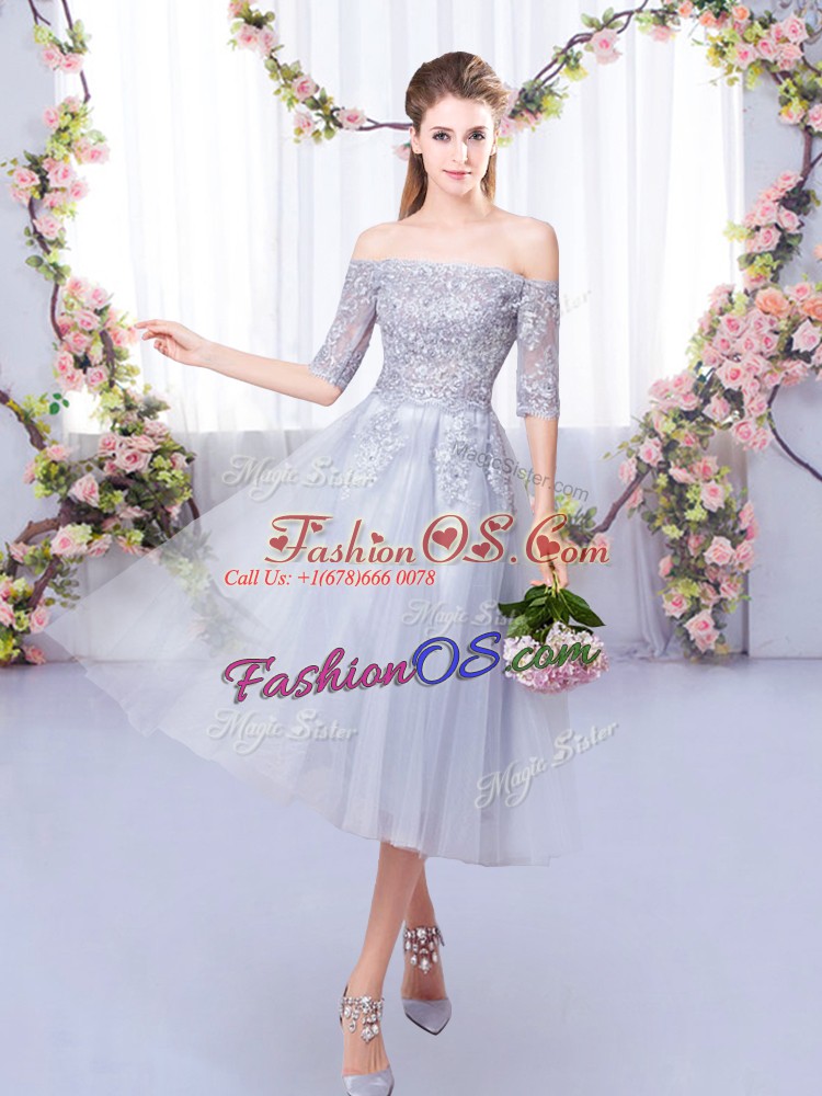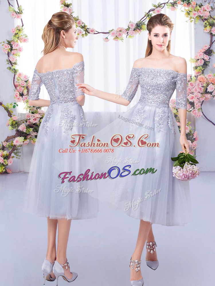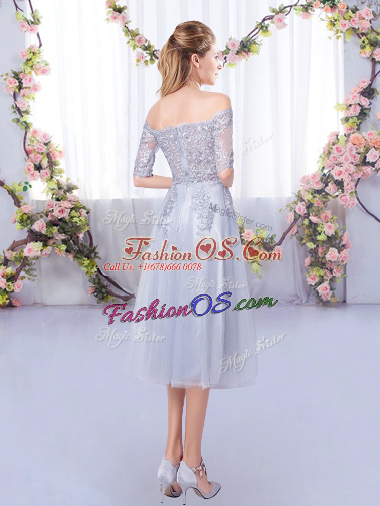 Grey Empire Off The Shoulder Half Sleeves Tulle Tea Length Zipper Lace Quinceanera Court of Honor Dress