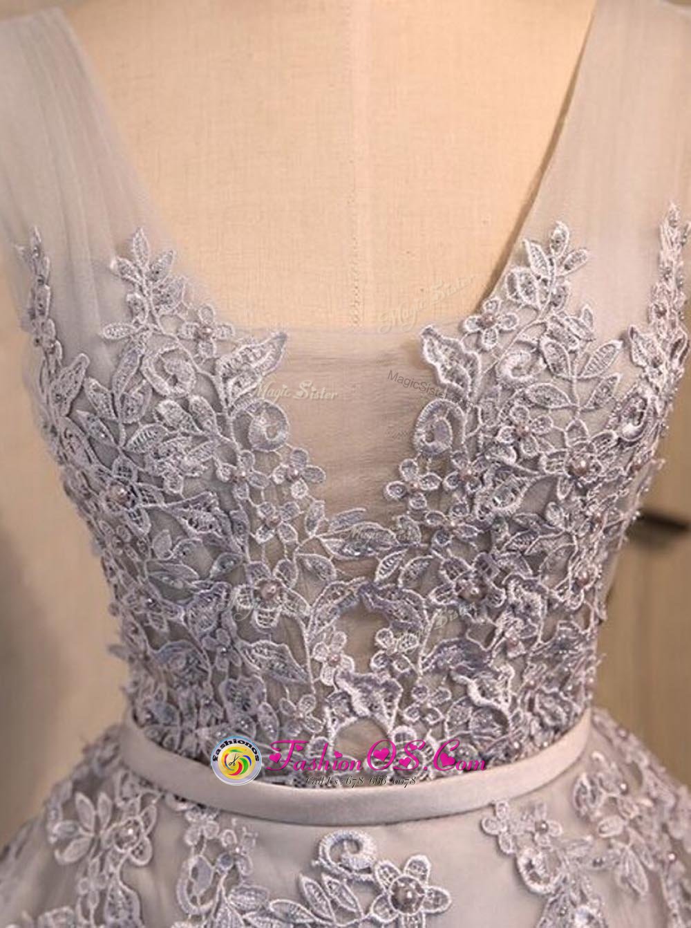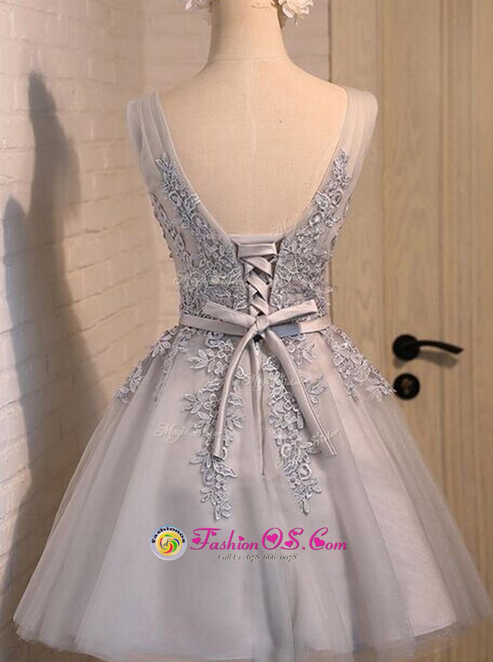 Grey Lace Up Dress for Prom Beading and Appliques Sleeveless Mini Length