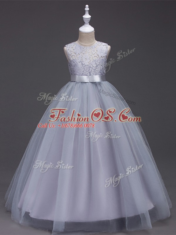 Grey Sleeveless Lace Floor Length Pageant Gowns For Girls