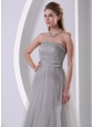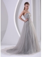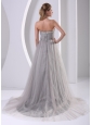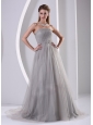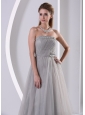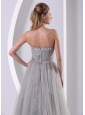 Grey Tulle A-line Strapless Beaded Simple Plus Size Prom Dress With Sweep Train