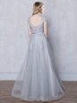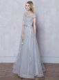 Home >  Special Occasion Dresses >  Dama Dresses for Quinceanera > Grey Tulle Lace Up Scoop Cap Sleeves Floor Length Quinceanera Dama Dress Lace and Appliques and Belt