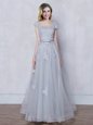 Grey Tulle Lace Up Scoop Cap Sleeves Floor Length Quinceanera Dama Dress Lace and Appliques and Belt