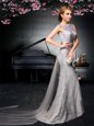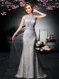 Home >  Prom Dresses >  Modest Prom Dresses > Grey V-neck Backless Appliques and Belt Evening Dress Brush Train Sleeveless