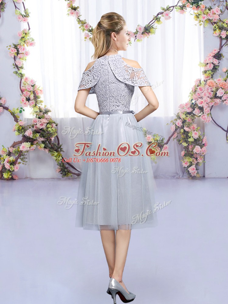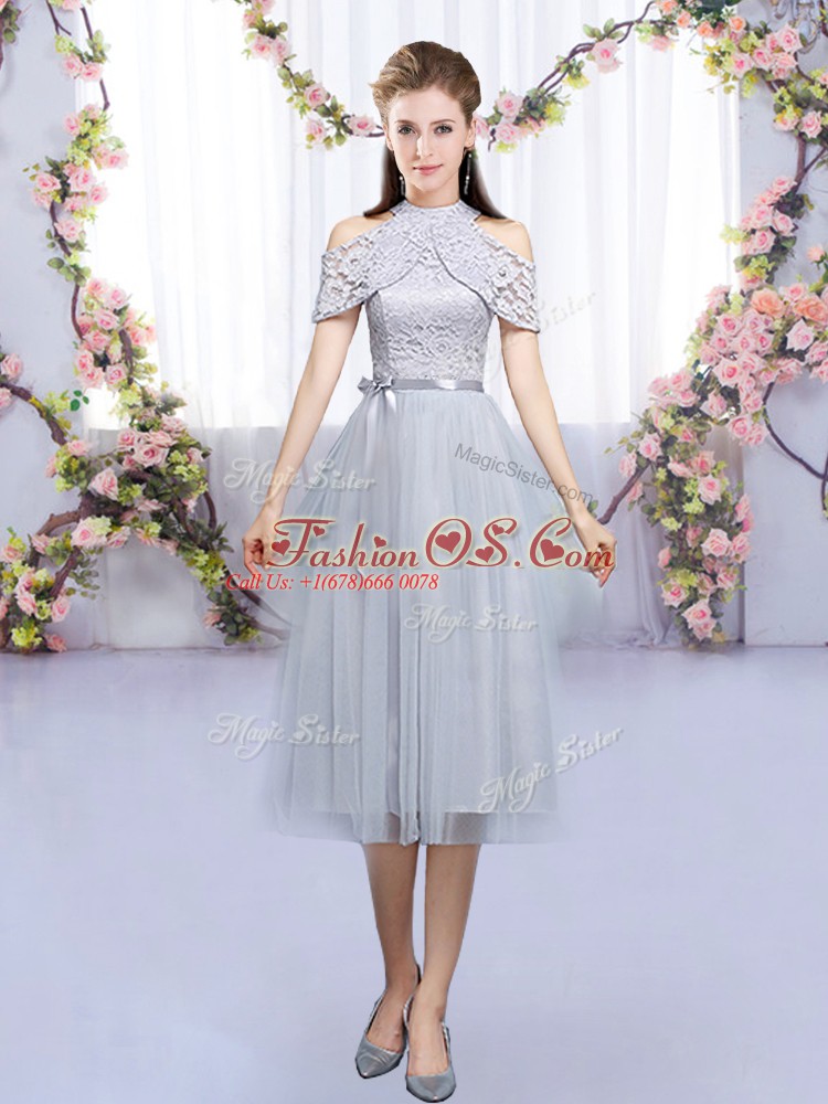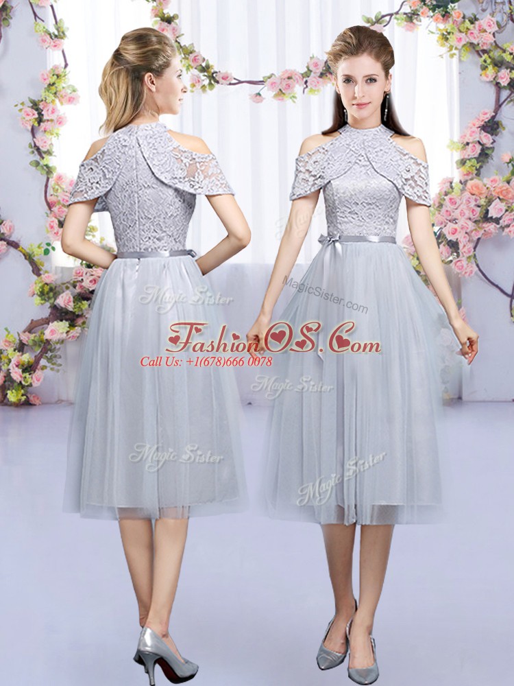 Home >  Bridesmaid Dresses >  Perfect Bridesmaid Dresses > Grey Zipper High-neck Lace and Belt Bridesmaids Dress Tulle Sleeveless