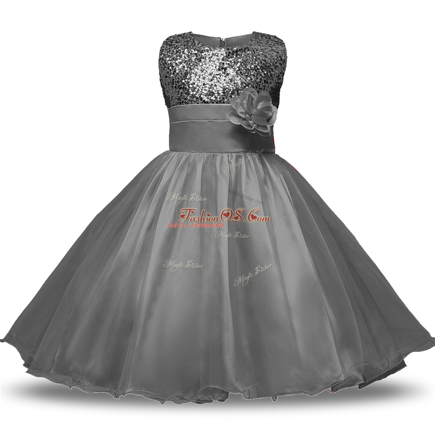 Grey Zipper Scoop Bowknot and Belt and Hand Made Flower Flower Girl Dresses Organza and Sequined Sleeveless
