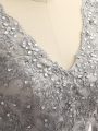 Home >  Special Occasion Dresses >  Elegant Mother of the Bride Dresses > Grey Zipper V-neck Lace and Appliques Mother Of The Bride Dress Chiffon Long Sleeves