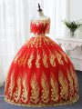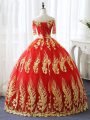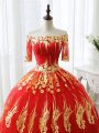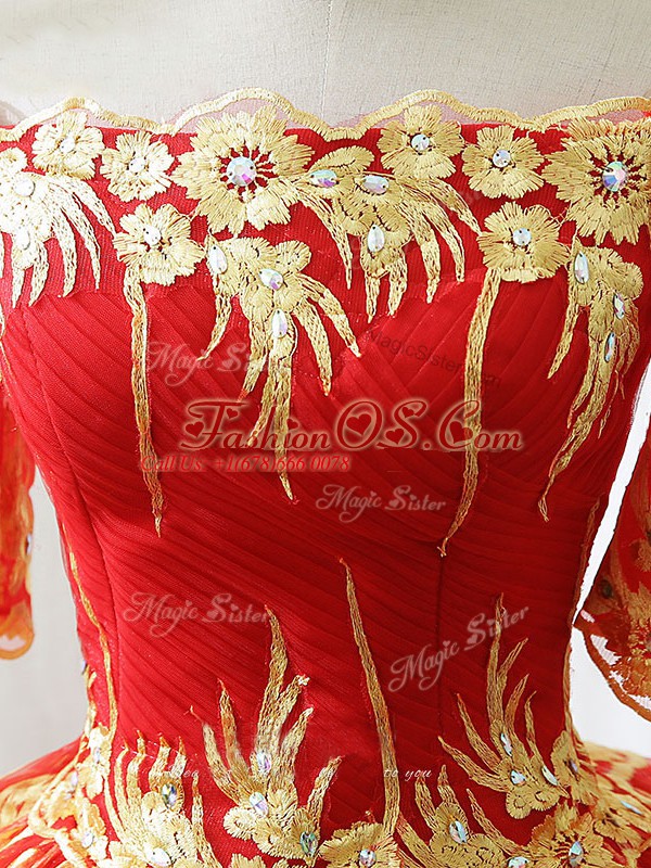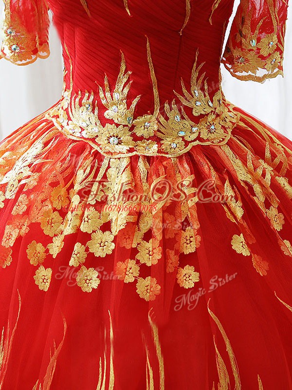Half Sleeves Floor Length Appliques Lace Up Quinceanera Gowns with Red