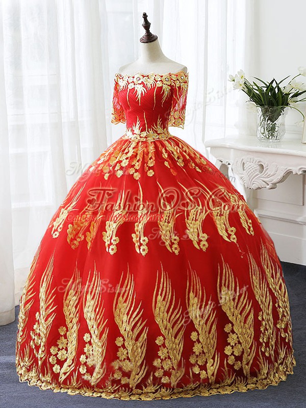 Home >  Quinceanera Dresses >  In Stock Quinceanera Dresses > Half Sleeves Floor Length Appliques Lace Up Quinceanera Gowns with Red