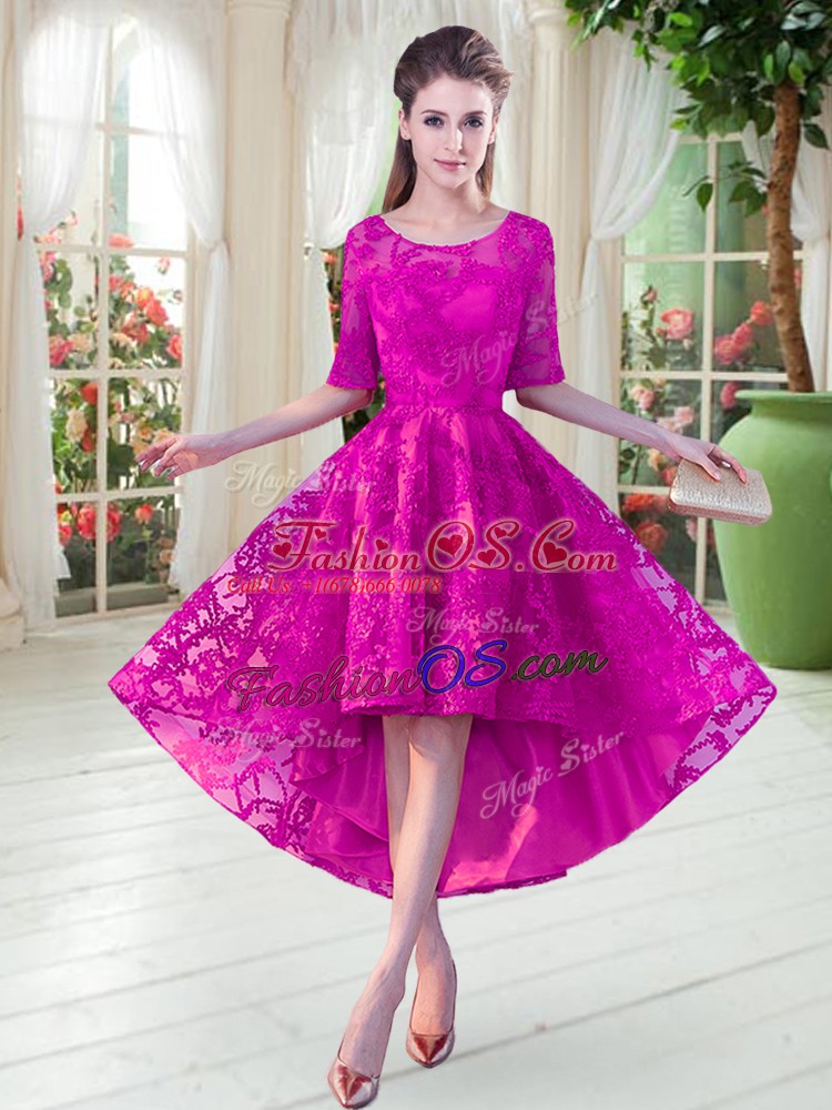 Half Sleeves High Low Zipper Prom Evening Gown in Fuchsia with Lace