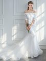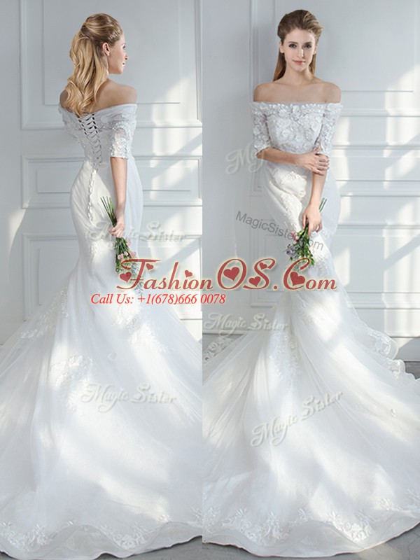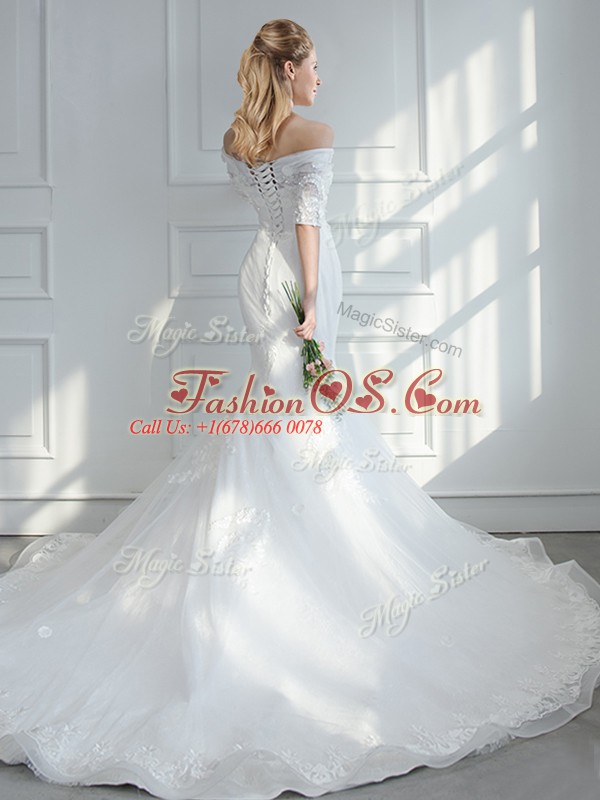 Half Sleeves Lace and Appliques Lace Up Wedding Gowns with White Court Train