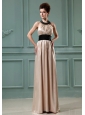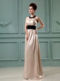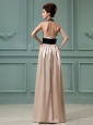 Can't decide what to wear for your formal evening? This one might be a good choice for you. Halter top design with black accents higlight the whole looking. Elegance is the word describes this gown properly, fitted waist with black waistband contrasting with the champagne color adds interests to the dress. Completed with a zipper up back, the dress is a perfect choice for your special day.