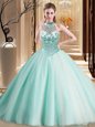 Halter Top Aqua Blue Lace Up Quinceanera Gowns Beading Sleeveless With Brush Train