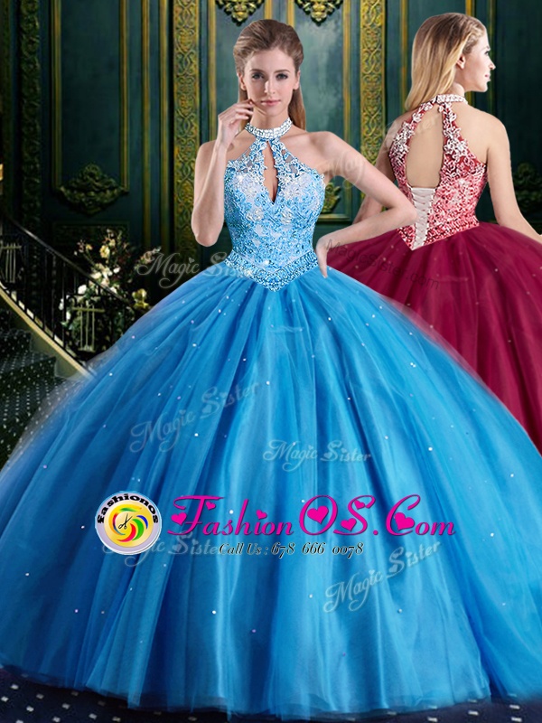 Halter Top Baby Blue Sleeveless Floor Length Beading and Lace and Appliques Lace Up Sweet 16 Quinceanera Dress