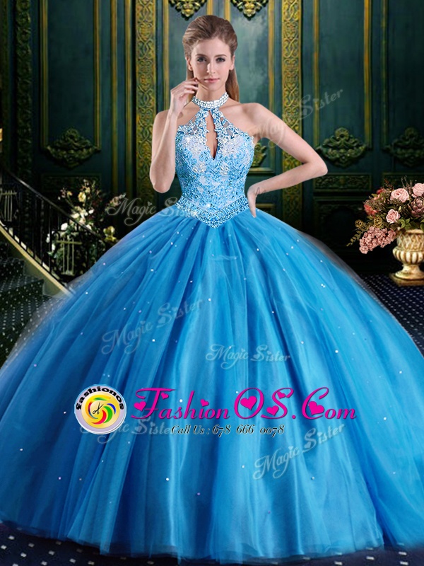 Home >  Quinceanera Dresses >  Cheap Quinceanera Dresses > Halter Top Baby Blue Sleeveless Floor Length Beading and Lace and Appliques Lace Up Sweet 16 Quinceanera Dress