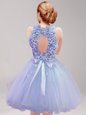 Home >  Prom Dresses >  Unique Prom Dresses > Halter Top Backless Mini Length Blue Homecoming Dress Tulle Sleeveless Ruffles and Hand Made Flower