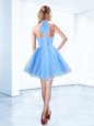 Home >  Prom Dresses >  Sexy Prom Dresses > Halter Top Blue Organza Zipper Prom Party Dress Sleeveless Floor Length Ruching and Belt