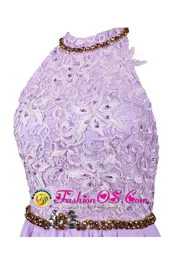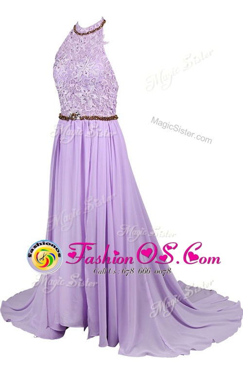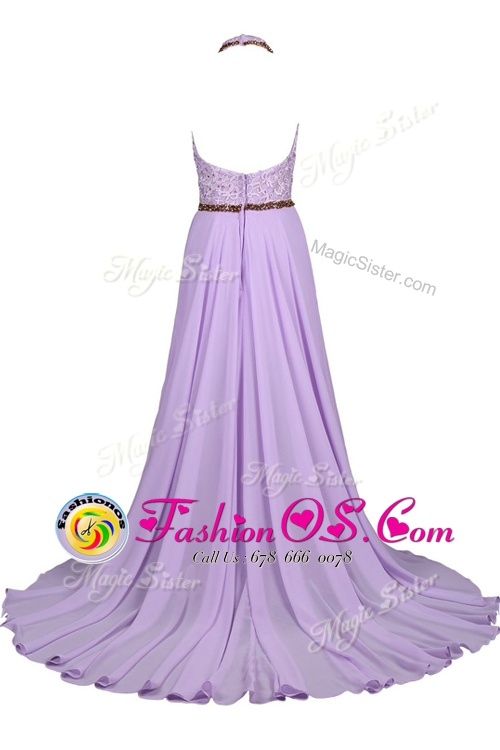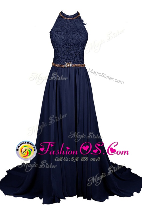 Halter Top Chiffon and Lace Sleeveless Floor Length Prom Evening Gown and Beading